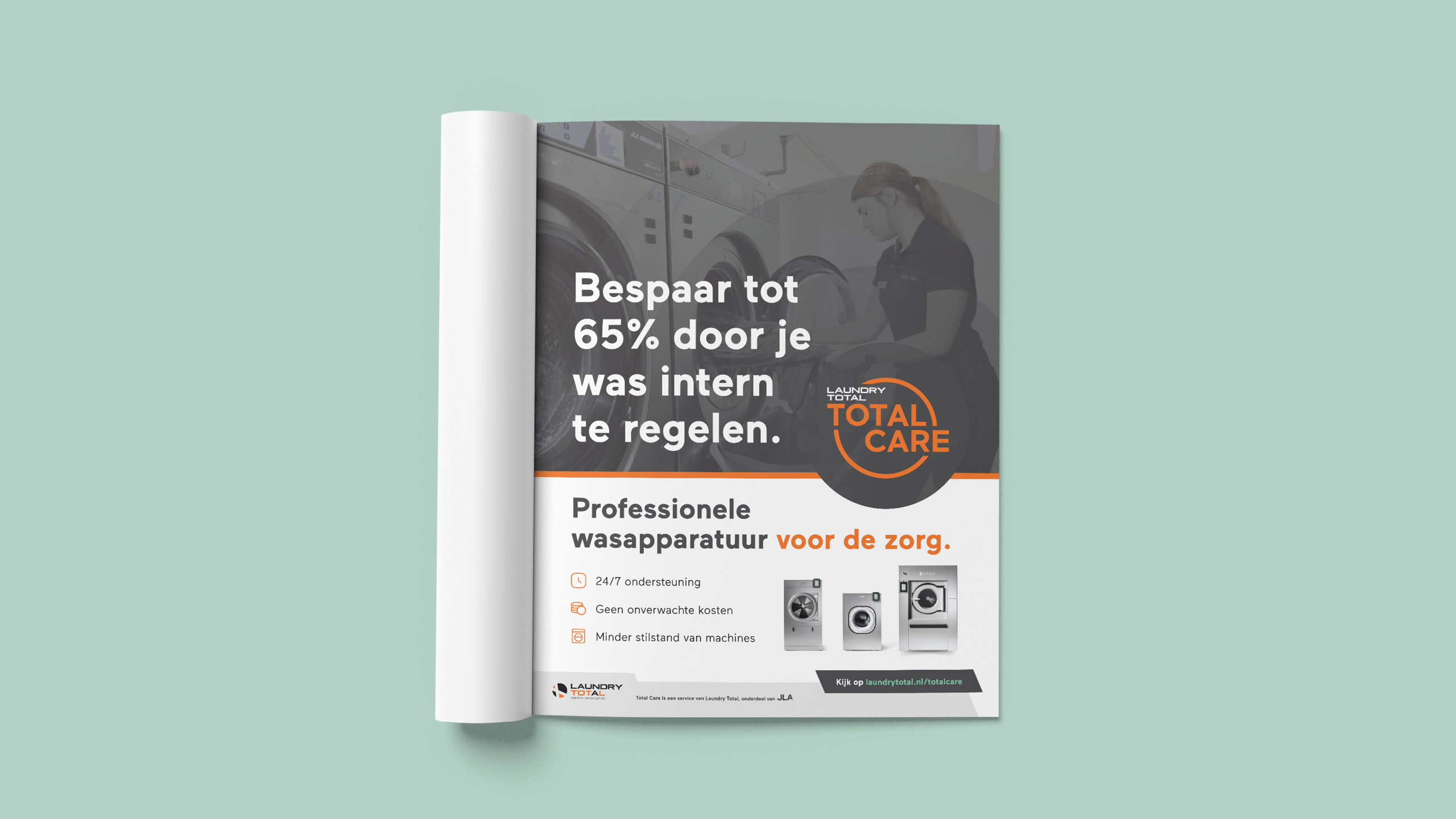 We schreven een publiciteitsplan en gingen aan de slag met uitvoering. Advertenties, promotiematerialen, redactionele aandacht in vakmedia: alles werd verzorgd. We kochten advertentieruimte in, ontwikkelden de middelen en leverden aan bij de juiste platforms. JLA en Laundry Total hoefden nergens naar om te kijken. Total Care werd zichtbaar , precies in de sectoren waar het ertoe doet.