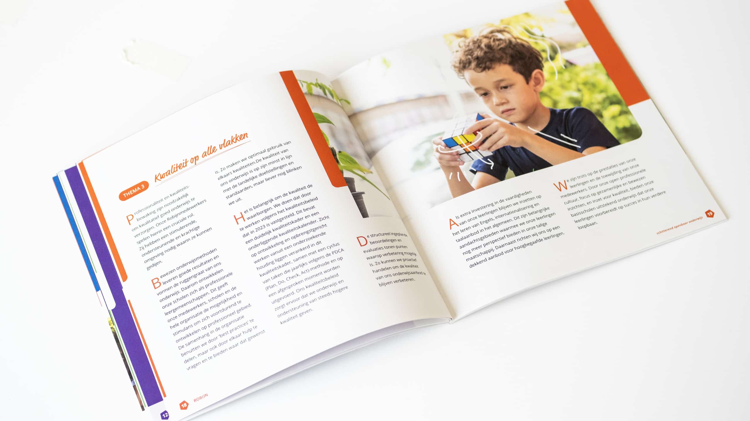 Op basis van de huisstijl gingen we aan de slag. De oude vertrouwde stijl vulden we aan. Van een extra lettertype tot de fotografie en illustraties. Alles om wat meer beleving en het speelse karakter van het basisonderwijs door te voeren in het beleid. Zo ziet dat eruit!